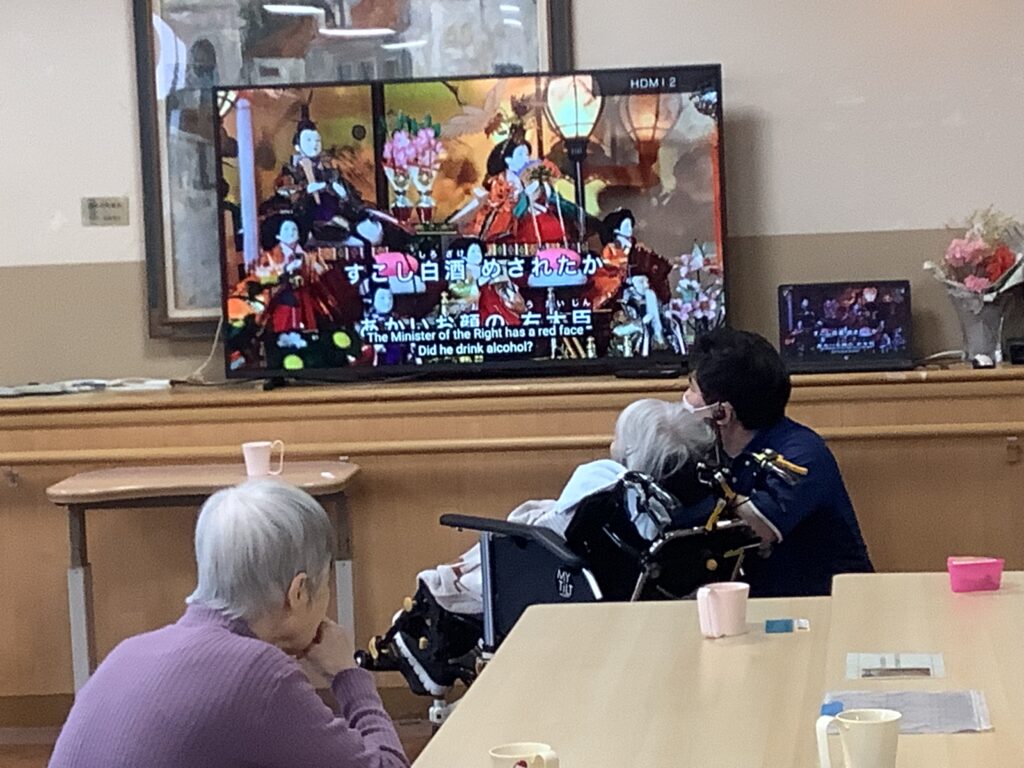 ひな祭りによく流れている「花」、「春よ来い」、「嬉しいひな祭り」、「さくらさくら」をテレビで流し利用者の皆様と合唱しました皆様「懐かしいなー」とつぶやきながら知っている曲を歌われていました(^^)/