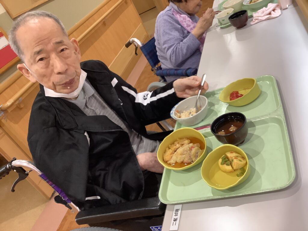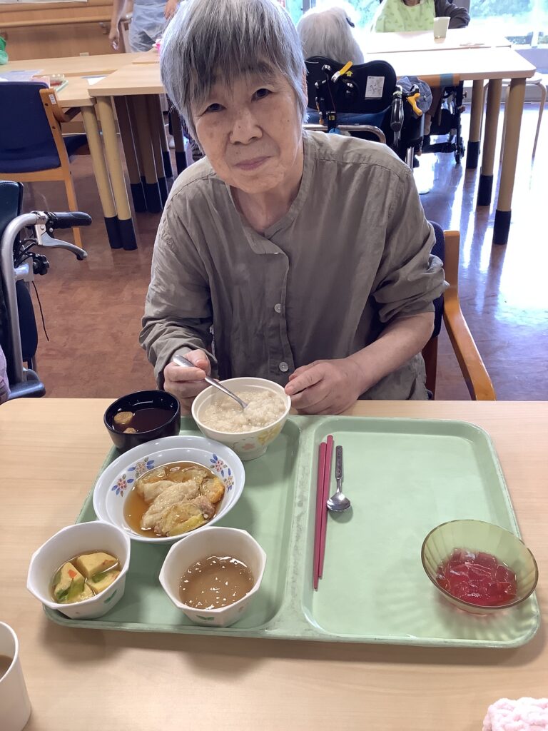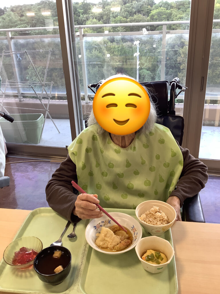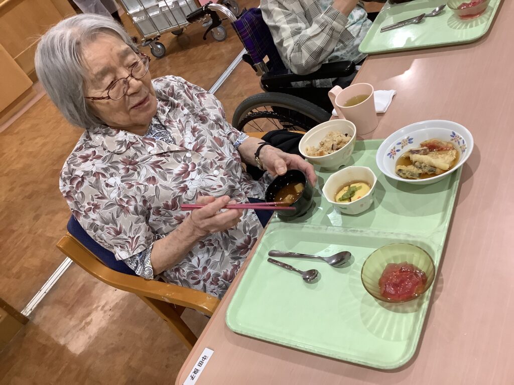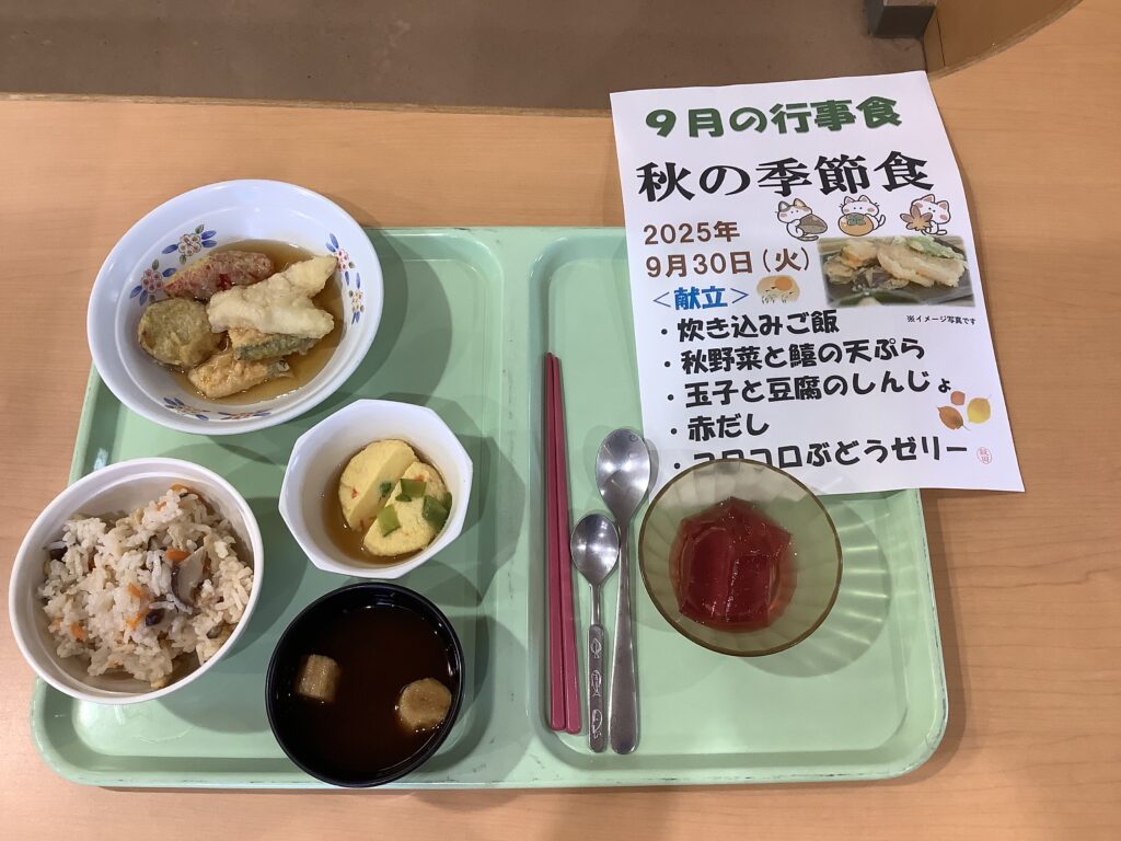 9月30日の昼食には秋の季節食として炊き込みご飯、秋野菜と鱧の天ぷら、玉子と豆腐のしんじょ、赤だし、コロコロぶどうゼリーが提供されました♪