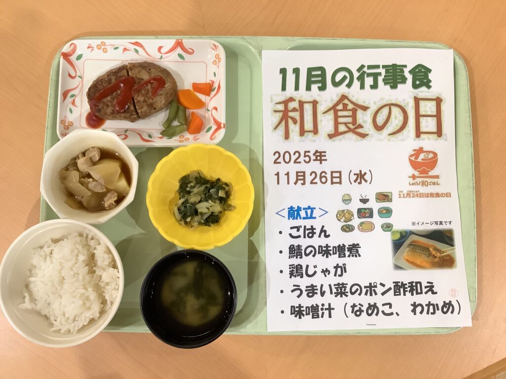 11月26日の昼食には、11月の行事食「和食の日」として、ご飯、鯖の味噌煮、鶏じゃが、うまい菜のポン酢和え、味噌汁が提供されました♪