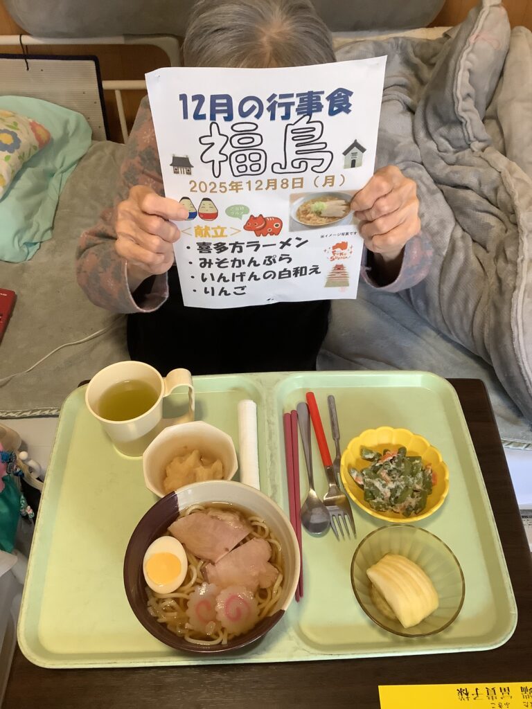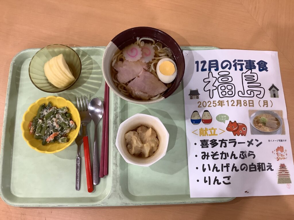 12月8日の昼食には12月のご当地食「福島県」として喜多方ラーメン🍜、みそかんぷら、いんげんの白和え、りんごが提供されました♪