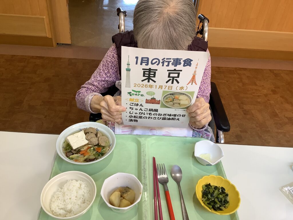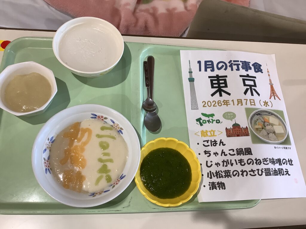 1月7日の昼食にご飯、ちゃんこ鍋風、じゃがいものねぎ味噌のせ、小松菜のわさび醤油和え、漬物が提供されました。
