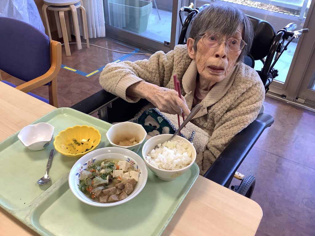 今回一般食の利用者の方にはちゃんこに入っている豆腐が切られず大きいままで入っていたので見た目も良し、食べ応えも良さそうな印象でした(*’▽’)